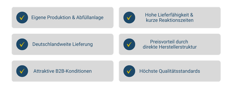 Mit eigener Produktion und eigener Abfüllanlage garantieren wir gleichbleibende Qualität, schnelle Lieferzeiten und wettbewerbsfähige Preise.